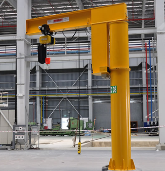 上軸承座中的滾動軸承是向心球軸承或圓錐滾子軸承,下軸承座中的滾動軸承是圓錐滾子軸承或是向心球軸承和單向推力球軸承的組合。不僅結構簡單,還能使橫梁和立柱作旋轉運動,其吊裝作業非常方便。旋轉式懸臂吊的吊具的橫梁與立柱下部固定連接,立柱上下端部分別通過滾動軸承安裝在上下軸承座內,因此,立柱能繞其軸心線作旋轉運動,橫梁及懸掛在橫梁上的跑車也能隨著立柱轉動。作業時,能在一定范圍內吊裝工件重物,大大減少搬運人員的勞動強度,其吊裝作業非常方便。
